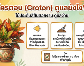 วิธีดูแลโครตอน (Croton) ให้ใบสีสด สวยงาม — คู่มือมือใหม่ฉบับสมบูรณ์ โครตอน (Croton) หรือชื่อวิทยาศาสตร์ว่า Codiaeum variegatum คือหนึ่งในไม้ประดับที่มีสีสันสวยงามที่สุดในโลก ใบของมันมีสีแดง ส้ม เหลือง เขียว และแม้กระทั่งม่วง ปะปนกันในใบเดียว ทำให้ดูสดใสเหมือนภาพวาด ไม่น่าแปลกใจที่หลายคนหลงรักโครตอนตั้งแต่แรกเห็น โครตอน ไม้ประดับสีสันสวยงาม ดูแลง่าย แต่หลายคนที่ซื้อโครตอนมาแล้วพบว่า “ใบเริ่มซีด...