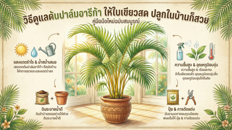 ต้นปาล์มอารีก้า (Areca Palm) หรือที่รู้จักในชื่อ Butterfly Palm และ Golden Cane Palm เป็นไม้ประดับยอดนิยมที่ปลูกได้ทั้งในบ้านและนอกบ้าน มีใบยาวโค้งสวยงาม ให้ความรู้สึกเขตร้อนชื้น และยังได้รับการจัดอันดับจาก NASA ว่าเป็นหนึ่งในต้นไม้ฟอกอากาศที่ดีที่สุด บทความนี้รวมทุกอย่างที่ต้องรู้เกี่ยวกับการดูแลปาล์มอารีก้า ตั้งแต่แสง น้ำ ดิน ปุ๋ย ไปจนถึงวิธีแก้ปัญหาที่พบบ่อย