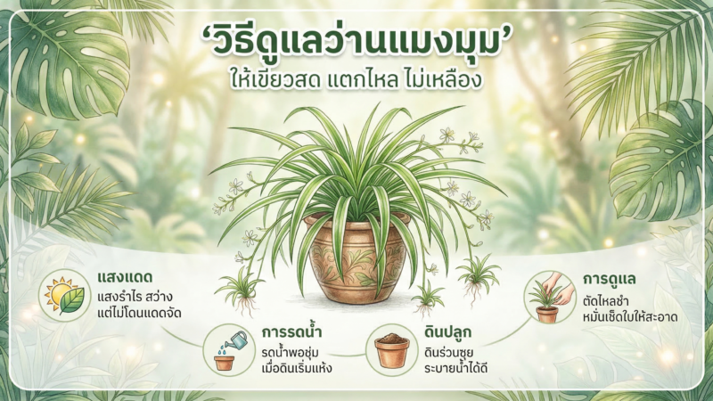ว่านแมงมุมเหมาะมากสำหรับคนที่ปลูกต้นไม้ในบ้านหรือคอนโด เพราะทนทานต่อสภาพแสงน้อย ไม่ต้องรดน้ำบ่อย และเติบโตได้ดีแม้ในอากาศแห้ง บทความนี้จะพาคุณรู้จักว่านแมงมุมแบบครบถ้วน ตั้งแต่การเลือกดิน การรดน้ำ การใส่ปุ๋ย การขยายพันธุ์ ไปจนถึงการแก้ปัญหายอดฮิต