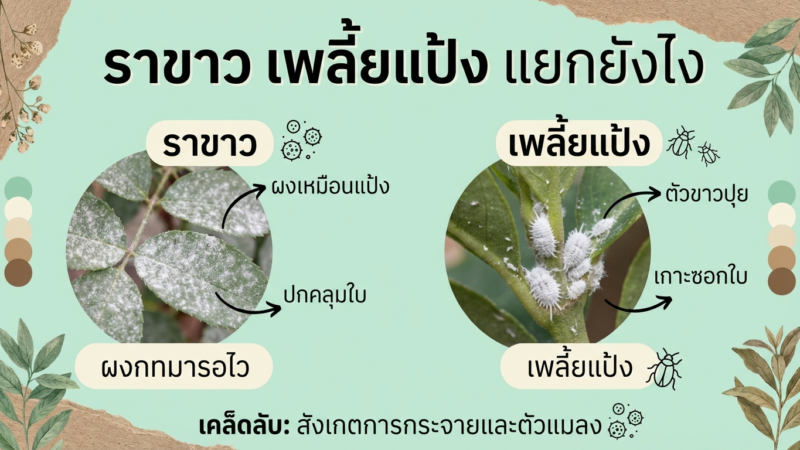 สังเกตเห็น ปุยขาวๆ หรือฝ้าขาวเหมือนแป้ง บนใบ ลำต้น หรือดิน? นั่นอาจเป็น ราขาว (Powdery Mildew) หรือ เพลี้ยแป้ง — สองปัญหาที่หน้าตาคล้ายกันแต่แก้คนละวิธี!
