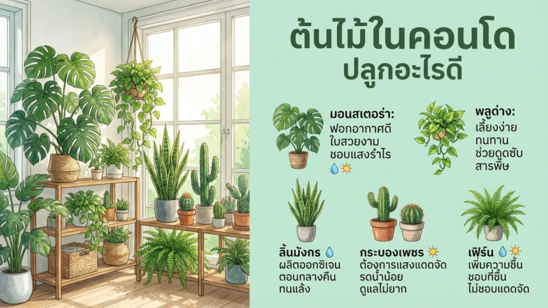 อย่าห่วง! ต้นไม้ประดับหลายชนิด ทนร่ม ทนแอร์ ดูแลง่าย เหมาะกับชีวิตคอนโดมาก บทความนี้จัดอันดับ 10 ต้นไม้ที่ปลูกในคอนโดได้ดีที่สุด พร้อมวิธีดูแลสั้นๆ